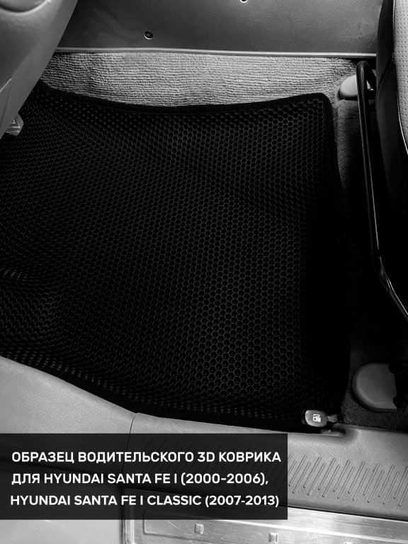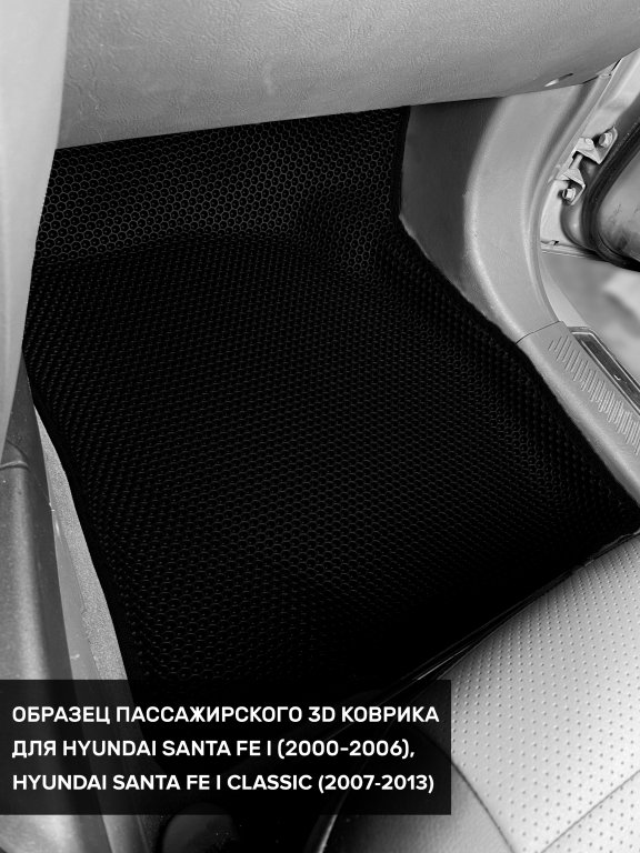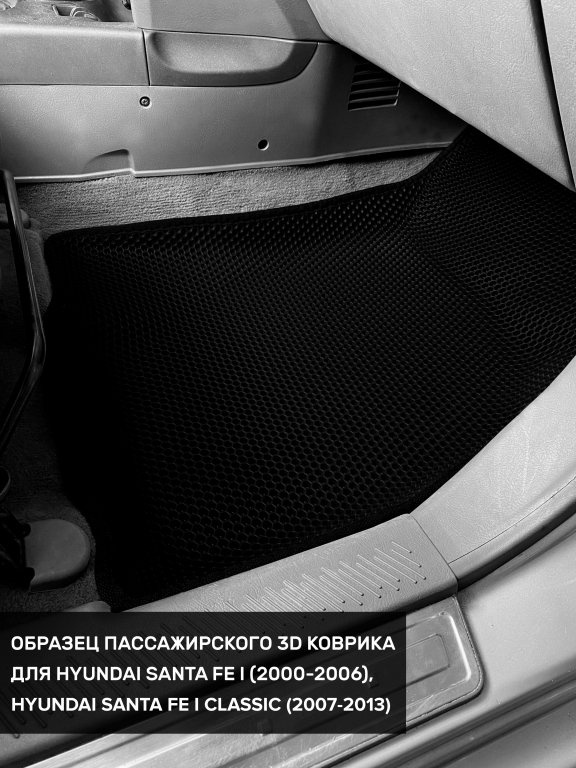 Автомобильные 3д коврики для Hyundai Santa Fe I Classic (2007-2013) в салон авто и багажник сделаны из инновационного полимерного материала EVA, изысканная структура в виде ячеек не дает воде, пыли и снегу разлетаться по салону машины и багажнику. 3д коврики зафиксированы на полу определенными клипсами, соответствующими Hyundai Santa Fe I Classic (2007-2013), и не двигаются в процессе езды.